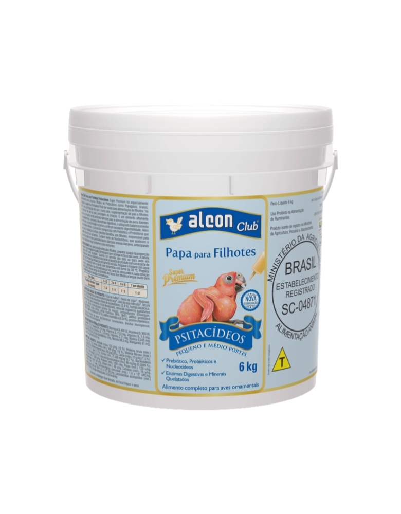 Alcon Club Papa para Filhotes Psitacídeos Super Premium foi especialmente desenvolvido para alimentar filhotes de Psitacídeos como Papagaios, Araras, Calopsitas, Agapornis e Periquitos. Pode ser usado para alimentação de filhotes “na mão”, sem a participação dos pais, como para a suplementação de pais e filhotes em sistemas em que os pais participam da criação. É um alimento altamente nutritivo e completo, sendo indicado também para a alimentação de aves doentes ou convalescentes. A presença de enzimas digestivas, o adequado balanceamento de nutrientes e a uniformidade na textura conferem excelente digestibilidade. Além de vitaminas e minerais, o alimento é enriquecido com Prebiótico e Probióticos que favorecem a instalação da flora intestinal benéfica aos filhotes, responsável pela melhor absorção de nutrientes. Contém fonte de Nucleotídeos, que aceleram o desenvolvimento do trato gastrointestinal e glândulas anexas das aves, antecipando a capacidade ideal de aproveitamento dos nutrientes.