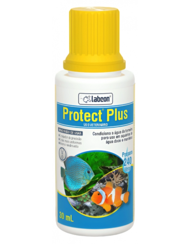 Use Labcon Protect Plus na montagem de aquários marinhos ou de água doce, nas trocas parciais da água, durante o transporte dos peixes e após o tratamento com medicamentos.