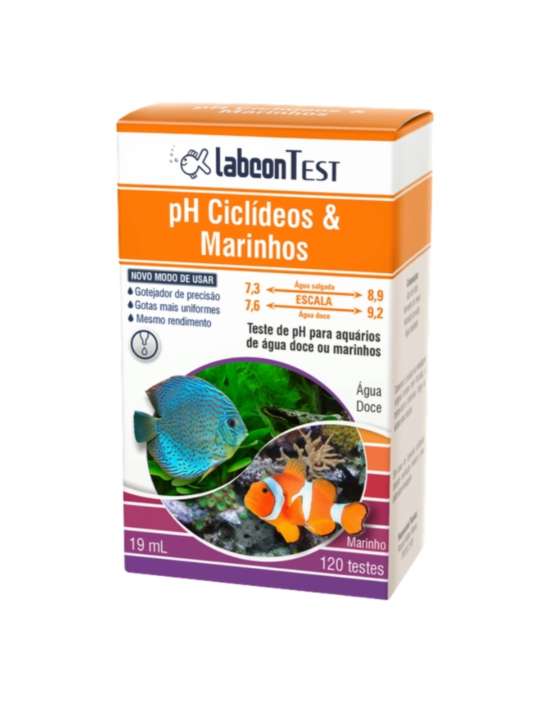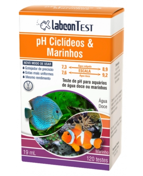 Labcon Test pH Ciclídeos & Marinhos é indicado para a verificação do pH de água salgada ou doce, dentro da faixa de pH alcalino, como os aquários marinhos e de Ciclídeos africanos. No ambiente natural marinho, assim como nos grandes lagos de origem dos Ciclídeos africanos, o pH alcalino praticamente não se altera. Por esta razão os organismos são pouco resistentes a eventuais alterações de pH. No ambiente limitado do aquário o pH tende a acidificar, devido principalmente à decomposição dos resíduos orgânicos acumulados. Tal situação resulta em estresse para os peixes, com consequente aumento da suscetibilidade dos organismos a doenças e outros males.