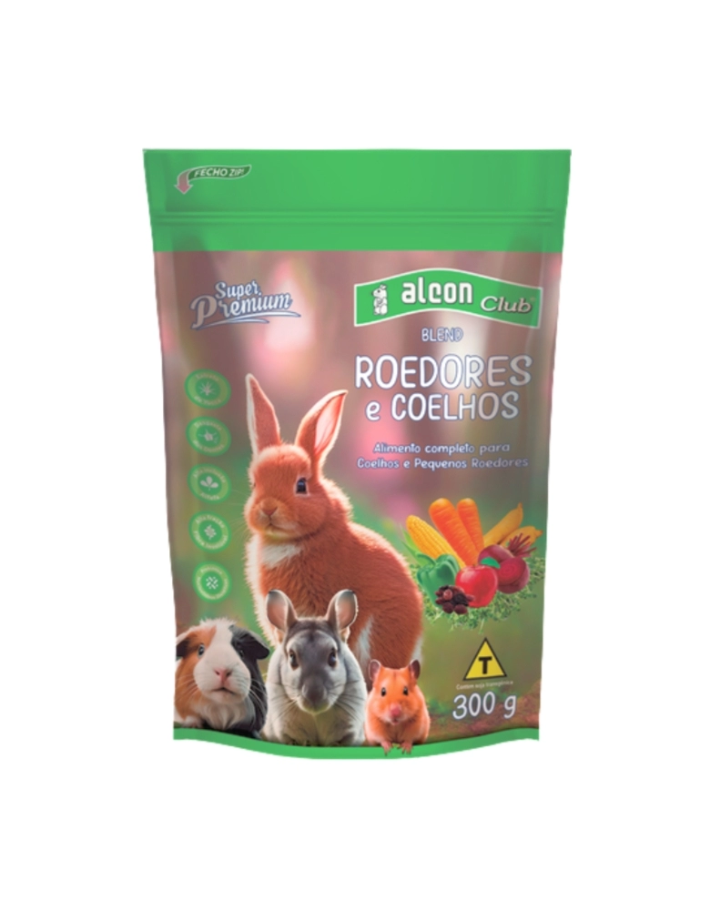 Alcon Club Blend Roedores e Coelhos Super Premium é um alimento completo, cientificamente elaborado para suprir as necessidades nutricionais e energéticas de Mini Coelhos, Coelhos de companhia e pequenos roedores, como Porquinho da Índia, Chinchila, Hamster, Gerbil, e Topolino, durante a fase de manutenção. Sua composição diversificada, livre de corantes, palatabilizantes e aromatizantes, combina perfeitamente o alimento extrusado com frutas e legumes desidratados como cenoura, beterraba, maçã, mandioquinha, uva e pimentão. A cuidadosa seleção dos ingredientes confere ao alimento excelente palatabilidade e digestibilidade. Além de apresentar alta inclusão de fibra, é enriquecido com vitamina C, nucleotídeos, prebiótico e extrato de Yucca. Apresenta fração extrusada de alta dureza, especialmente desenvolvida para promover o desgaste dos dentes, que têm crescimento constante nesses animais.
