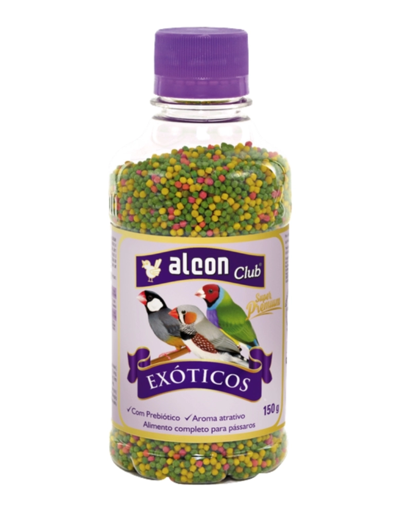 Alcon Club Exóticos Super Premium foi desenvolvido com ingredientes especiais para atender com altíssima qualidade as necessidades nutricionais de pássaros como Diamante de Gould, Mandarim, Manon e Calafate. É muito atrativo e apresenta alta digestibilidade, aroma agradável e sabor característico. Contém vitaminas e minerais de alto padrão, além de Prebiótico que promove o crescimento seletivo de bactérias benéficas presentes nos intestinos, melhorando o aproveitamento dos nutrientes. Contribui com a higiene e facilita o manejo, pois não há necessidade da rotina diária de limpeza dos comedouros, como ocorre com sementes e alimentos frescos.Sendo assim, o alimento pode ser fornecido para vários dias. Nos períodos de reprodução e muda de penas, acrescente à dieta Alcon Club Farinhada Canários Super Premium.