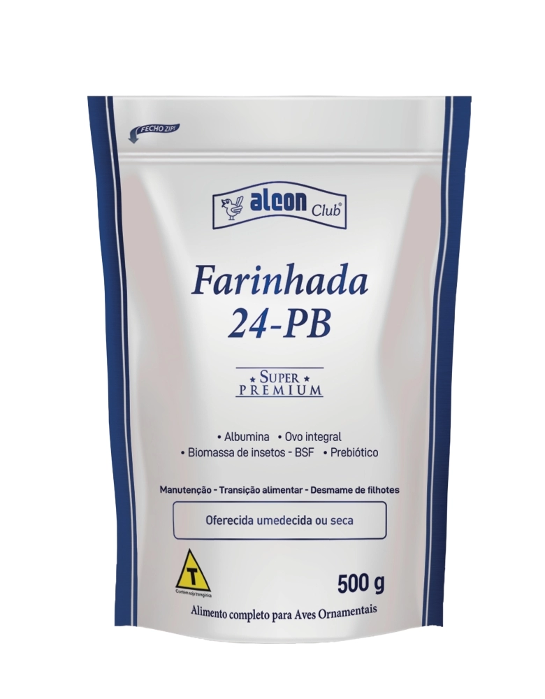 Alcon Club Farinhada 24-PB é um alimento completo Super Premium, cientificamente elaborado para suprir as necessidades nutricionais e energéticas de aves adultas durante a fase de manutenção ou como complemento da dieta em períodos especiais. Suas características particulares de textura, granulometria e maciez são ideais para os períodos de muda de bico, muda de penas e desmame de filhotes. Muito recomendado para realizar transições alimentares em aves que têm dificuldade em aceitar o alimento extrusado. Sua composição criteriosamente balanceada, livre de corantes artificiais e palatabilizantes, possui albumina, ovo integral e biomassa de insetos - BSF (Black Soldier Fly), uma fonte de proteína sustentável de alta biodisponibilidade, rica em ácidos graxos e aminoácidos. Apresenta alta digestibilidade e palatabilidade, além de ser um alimento muito atrativo às aves.