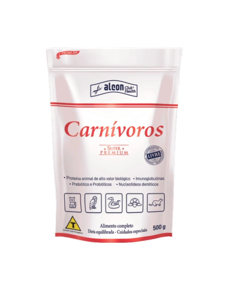 Alcon Club Health Carnívoros é um alimento completo Super Premium, cientificamente elaborado para suprir as necessidades nutricionais e energéticas de animais carnívoros com estado nutricional desajustado ou que apresentam necessidade de cuidados especiais por dificuldades de mastigação ou deglutição de alimento sólido. É indicado para animais como gatos, aves de rapina, serpentes, tartarugas, ferrets e hedgehogs. Muito recomendado para animais que necessitam recuperar o peso, já que fornece 4 kcal de energia metabolizável por grama de produto. Esse elevado nível energético ajuda a reduzir o volume necessário das refeições. Possui excelente diluição em água e pode ser utilizado para alimentação voluntária ou em nutrição enteral (via sondas). É um alimento com excelente digestibilidade e palatabilidade que foi desenvolvido para incentivar a aceitação por animais com apetite reduzido. Composto por ingredientes de alto valor biológico como plasma sanguíneo (fonte de imunoglobulinas), proteína hidrolisada de fígado de frango, ovo integral, farinha e óleo de salmão, prebiótico, probióticos e nucleotídeos dietéticos, proporciona diversos benefícios nutricionais e melhora o bem-estar dos animais.