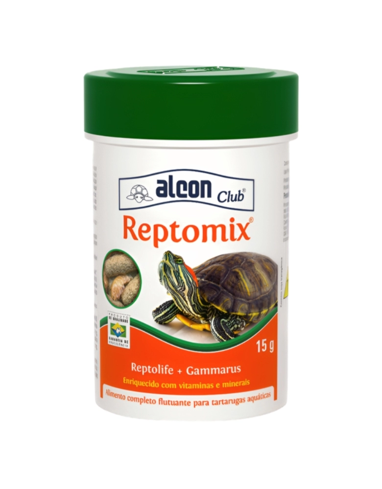 Alcon Club Reptomix Alimento completo para tartarugas aquáticasAlcon Club Reptomix é um alimento completo altamente atrativo que promove nutrição de qualidade para tartarugas aquáticas. Formado pelo alimento extrusado em bastões Alcon Club Reptolife, com sua formulação balanceada, associado em proporções adequadas ao alimento natural Gammarus sp, muito nutritivo e apreciado pelas tartarugas aquáticas. Enriquecido com vitaminas e minerais, proporciona adequado desenvolvimento e grande vitalidade a estes répteis. Não contém corantes artificiais.