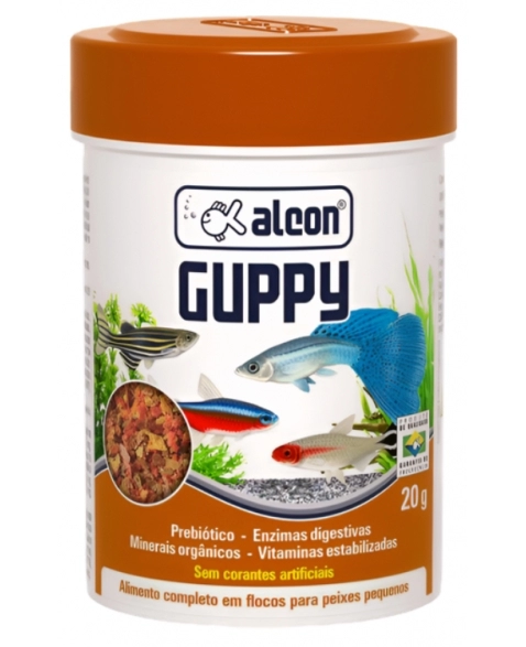 Alcon Guppy Alimento completo em flocos para peixes pequenos Alcon Guppy é especialmente recomendado para Lebistes e outros peixes de pequeno porte. Seus pequenos flocos possuem em sua formulação especial minerais orgânicos quelatados, que representam maior biodisponibilidade dos minerais ao organismo dos peixes. Enzimas Digestivas e Prebiótico favorecem o desenvolvimento da flora intestinal benéfica, melhorando o aproveitamento dos nutrientes. Não contém corantes artificiais. Para a manutenção adequada dos aquários utilize a linha de testes, condicionadores e corretivos Labcon.