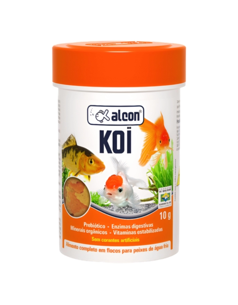 Alcon Koi Alimento completo em flocos para peixes de água fria Alcon Koi é um alimento em flocos de fácil assimilação e grande atratividade, desenvolvido para peixes de água fria como Kinguios (Goldfish) e Carpas (Koi). Sua formulação especial apresenta minerais orgânicos quelatados, que representam maior biodisponibilidade dos minerais ao organismo dos peixes. Enzimas Digestivas e Prebiótico favorecem o desenvolvimento da flora intestinal benéfica, melhorando o aproveitamento dos nutrientes. Não contém corantes artificiais. Para a manutenção adequada dos aquários utilize a linha de testes, condicionadores e corretivos Labcon. Modo de Usar Fornecer quantidade a ser totalmente consumida em até cinco minutos, de duas a quatro vezes por dia.