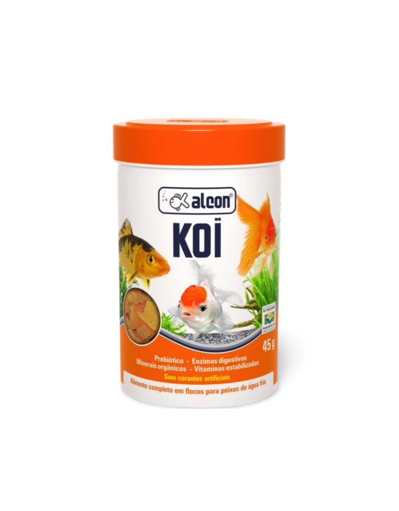 Alcon Koi Alimento completo em flocos para peixes de água fria Alcon Koi é um alimento em flocos de fácil assimilação e grande atratividade, desenvolvido para peixes de água fria como Kinguios (Goldfish) e Carpas (Koi). Sua formulação especial apresenta minerais orgânicos quelatados, que representam maior biodisponibilidade dos minerais ao organismo dos peixes. Enzimas Digestivas e Prebiótico favorecem o desenvolvimento da flora intestinal benéfica, melhorando o aproveitamento dos nutrientes. Não contém corantes artificiais. Para a manutenção adequada dos aquários utilize a linha de testes, condicionadores e corretivos Labcon. Modo de Usar Fornecer quantidade a ser totalmente consumida em até cinco minutos, de duas a quatro vezes por dia.