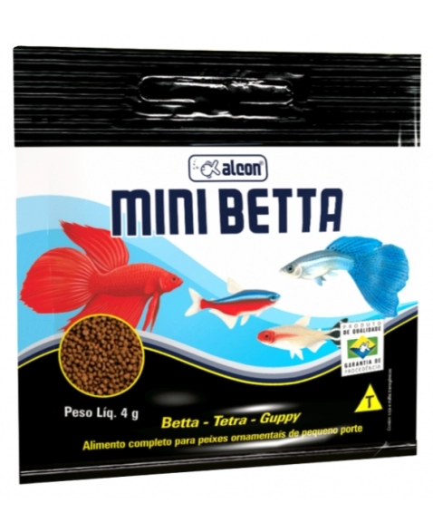 Alcon Mini Betta Alimento completo para peixes ornamentais de pequeno porte Alcon Mini Betta foi desenvolvido cuidadosamente para promover a nutrição saudável dos Bettas e outros peixes pequenos, tais como Tetras e Guppies. Sua formulação especialmente balanceada garante o suprimento ideal de nutrientes necessários ao bom desenvolvimento. Modo de Usar Oferecer duas a três vezes ao dia, em quantidade suficiente para ser consumida em até cinco minutos.Composição Básica do ProdutoFarinha de peixe, farelo de soja*, farinha de milho*, leveduras, proteína isolada de soja*, óleo de soja refinado*, proteína texturizada de soja*, premix vitamínico mineral, spirulina desidratada, corante vermelho allura, antioxidantes (ácido cítrico, BHA, BHT). *Espécies doadoras de gene: Agrobacterium tumefaciens, Bacillus thuringiensis, Streptomyces viridochromogenes. Enriquecimento por kg de Produto
