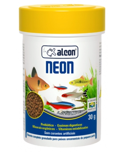 Alcon Neon foi elaborado com grande variedade de ingredientes de qualidade, para realçar as cores e garantir nutrição de qualidade aos peixes de pequeno porte como Neon, Rodóstomo, Tanictis, Paulistinha, Mato-Grosso, Ramirezi e Tetras. Seus pequenos e atrativos grânulos contém minerais orgânicos quelatados, que garantem maior biodisponibilidade dos minerais ao organismo, além do carotenoide astaxantina, que promove o realce das cores. Enzimas Digestivas e Prebiótico favorecem o desenvolvimento da flora intestinal benéfica, melhorando o aproveitamento dos nutrientes. Não contém corantes artificiais. Para a manutenção adequada dos aquários utilize a linha de testes, condicionadores e corretivos Labcon.