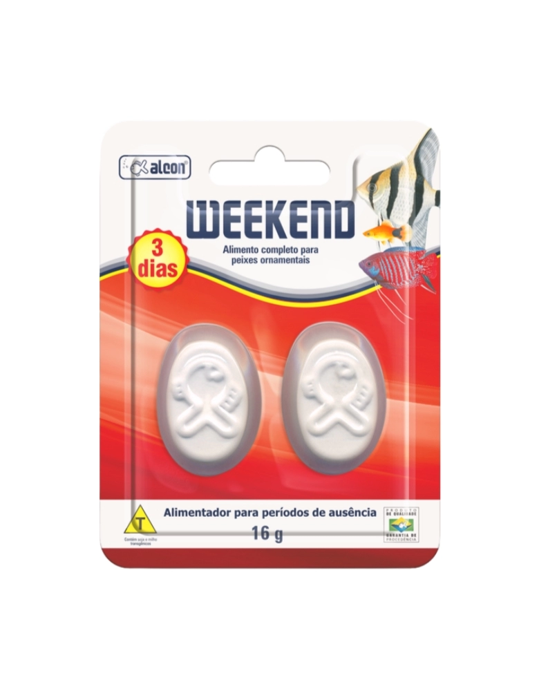 Alcon Weekend garante a alimentação dos peixes em períodos de viagens e ausência, quando não é possível alimentá-los diariamente com os alimentos tradicionais. Este facilitador é um bloco de sulfato de cálcio que serve de suporte para grânulos de alimento de qualidade, que são liberados aos peixes à medida que o bloco vai se dissolvendo na água do aquário.