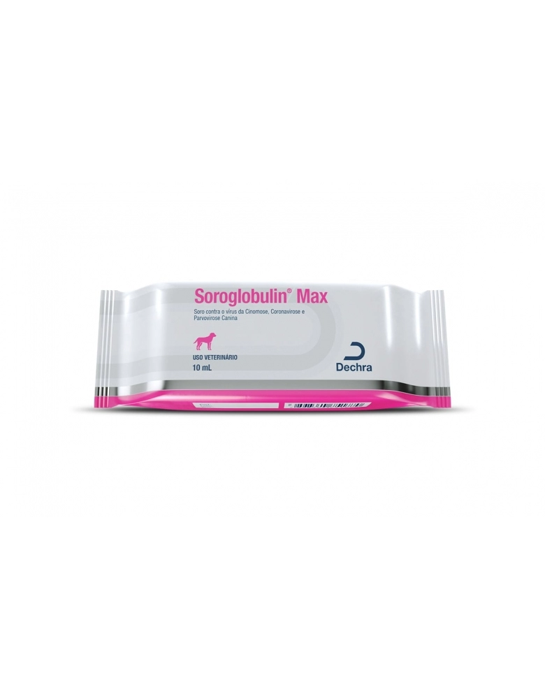 SOROGLOBULIN MAX é uma solução contendo imunoglobulinas específicas purificadas e concentradas, adicionadas de até 0,35% de fenol PA., obtidas a partir de plasma de equinos saudáveis hiperimunizados com vírus da Cinomose, Coronavirose e Parvovirose Caninas. Cada mL do produto neutraliza 10.000 TCID50 do Vírus da Cinomose canina,10.000 TCID50 do Parvovírus canino, 10.000 TCID50 do Coronavírus canino.