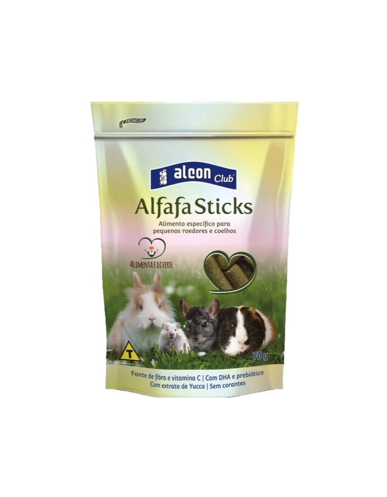 Alcon Club Alfafa Sticks é um alimento extrusado a base de alfafa, muito apreciado pelos pequenos roedores, como Hamster, Topolino, Gerbil, Porquinho da Índia e Chinchila, e também pelos Coelhos de estimação. Excelente fonte de fibra, importante nutriente para esses animais, também é rico em vitamina C e DHA (precursor de Ômega 3), além de prebiótico, que favorece o desenvolvimento da flora intestinal benéfica. Desempenha importante papel no desgaste dos dentes, que têm crescimento constante nesses animais. A presença de extrato de Yucca ajuda a reduzir o odor das fezes. Alimento produzido sem corantes.