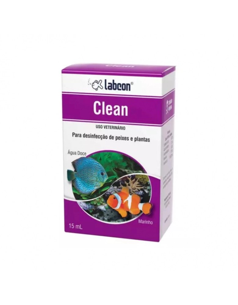 Para desinfecção de peixes ou plantas, com a bisnaga na posição vertical, adicionar 1 gota de Labcon Clean para cada 100 mL de água (10 gotas por litro). Aguardar de 20 a 30 minutos.