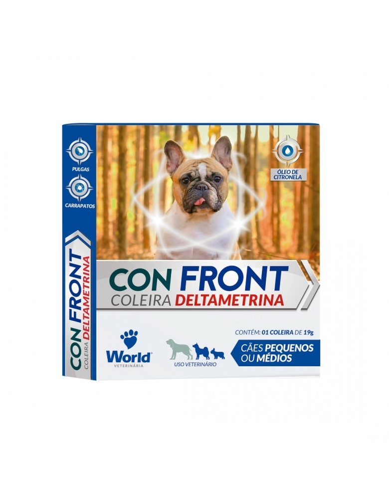 A Coleira ConFront é indicada para o tratamento de infestações causadas por carrapatos (Rhipicephalus sanguineus (nova denominação Rhipicephalus linnaei)) e pulgas (Ctenocephalides felis) em cães.