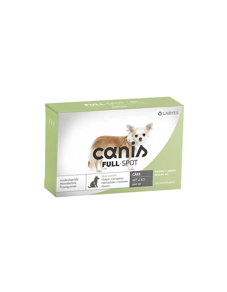 Canis Fullspot pode ser usado a partir das 6 semanas de vida ou 1 kg de peso, no tratamento, controle e prevenção de parasitoses externas, causadas por pulgas, carrapatos e ácaros da sarna, e parasitoses internas, causadas por nematóides e/o cestóides.