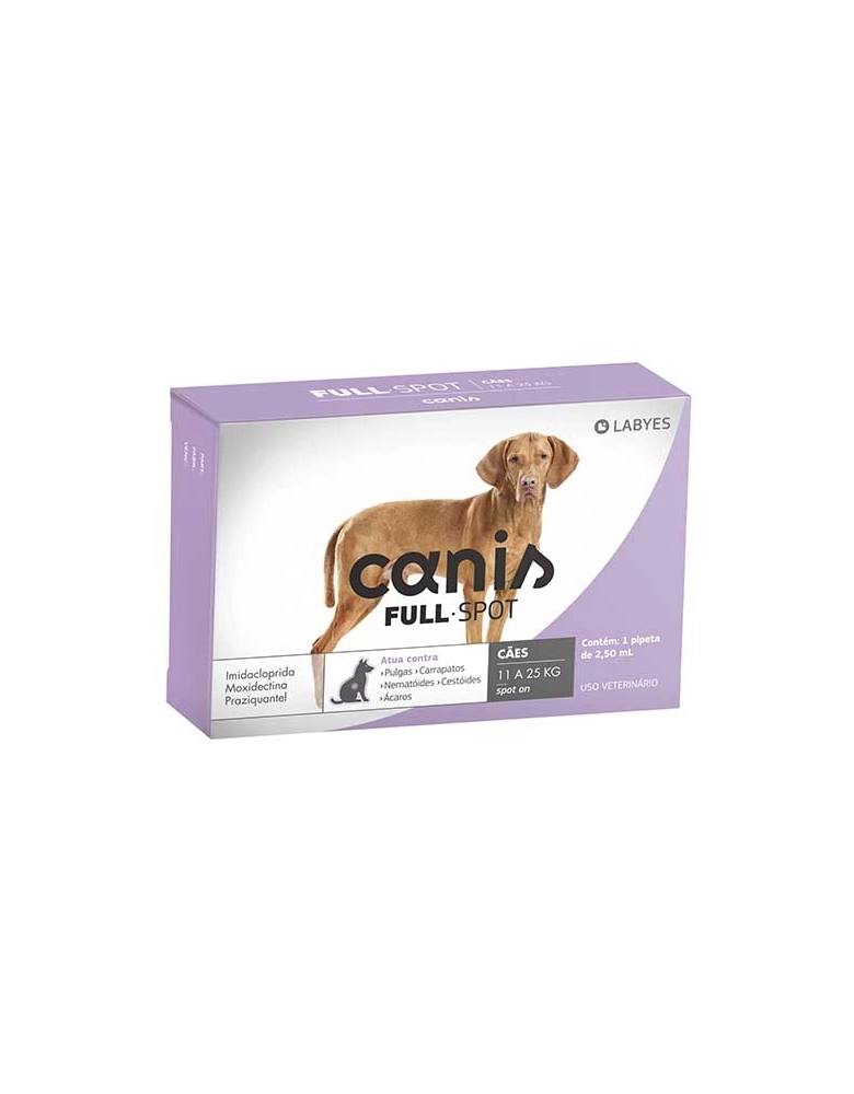 Canis Fullspot pode ser usado a partir das 6 semanas de vida ou 1 kg de peso, no tratamento, controle e prevenção de parasitoses externas, causadas por pulgas, carrapatos e ácaros da sarna, e parasitoses internas, causadas por nematóides e/o cestóides.
