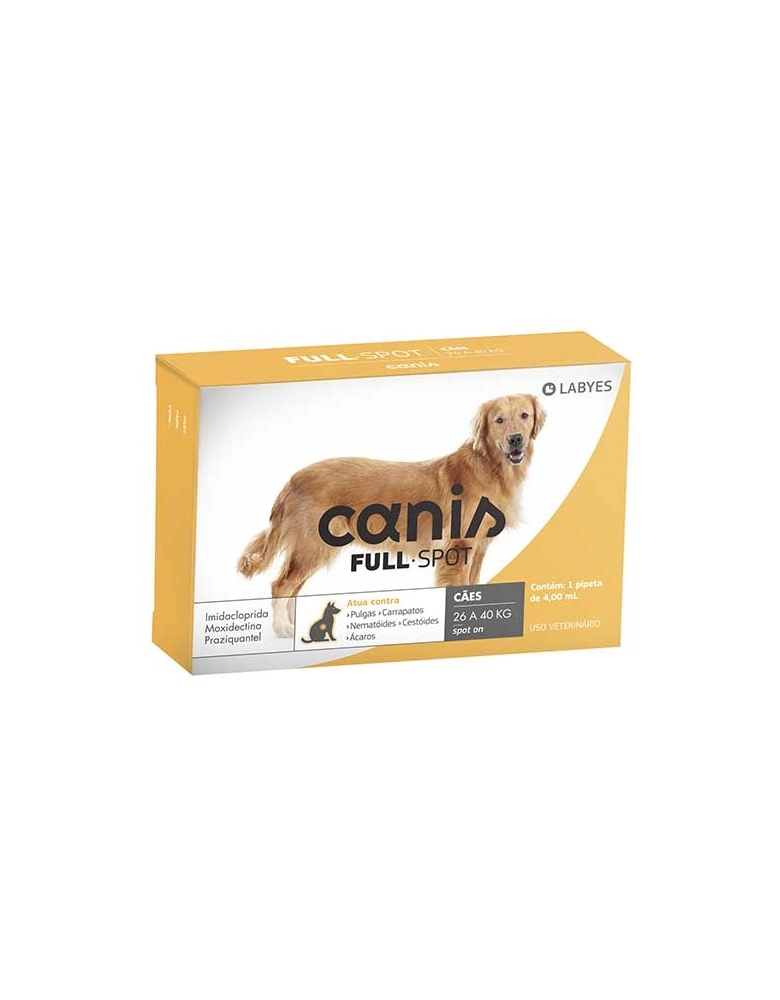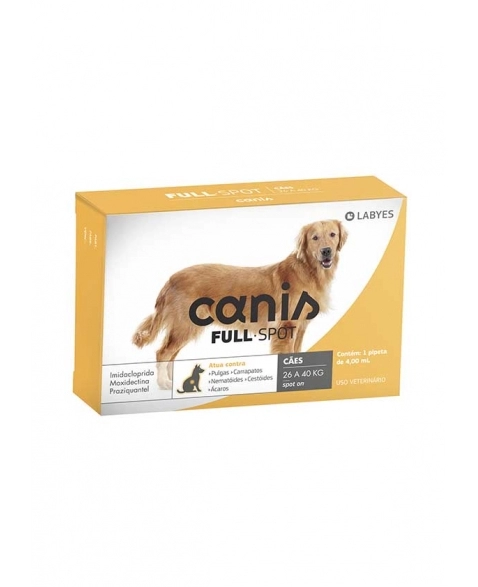 Canis Fullspot, antiparasitário externo e interno de aplicação spot-on. Sua fórmula altamente eficaz, elimina os parasitas internos e externos que frequentemente afetam os cães. A Moxidectina, pertencente ao grupo das Milbemicinas, tem uma concentração no Canis Fullspot que lhe confere eficácia contra carrapatos, além dos reconhecidos efeitos contra ácaros da sarna e nematóides. O Praziquantel, derivado sintético da isoquinolina-pirazina, possui efeito contra parasitas trematóides e cestóides. Imidacloprid, neonicotinoide apresenta rápido e potente efeito contra pulgas.