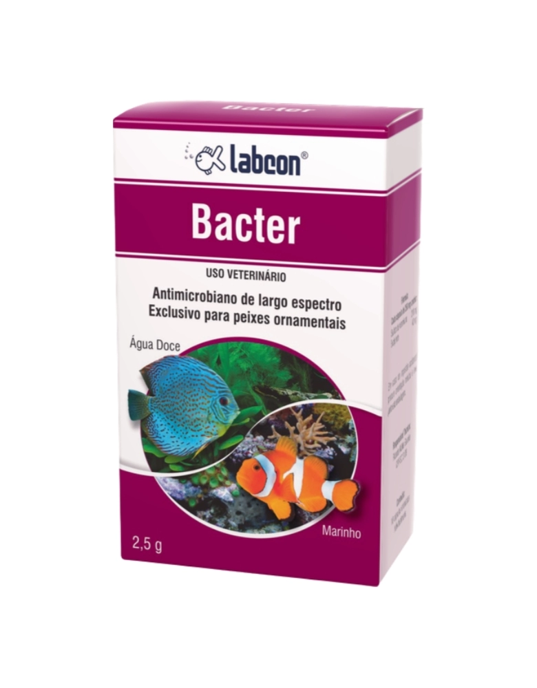 Labcon Bacter é composto de Sulfato de Neomicina, um agente antimicrobiano aminoglicosídico de largo espectro, com ação sobre bactérias gram-negativas. As bactérias de ocorrência nas doenças infecciosas dos peixes ornamentais pertencem, em grande parte, ao grupo gram-negativo. A sintomatologia destas bacterioses é muito variada e muitas vezes os peixes apresentam sintomas comuns causados por diferentes bactérias, além de outros agentes etiológicos como fungos e parasitas. Em muitos casos estas doenças apresentam-se em estado septicêmico (infecção generalizada), com as bactérias presentes em vários órgãos.