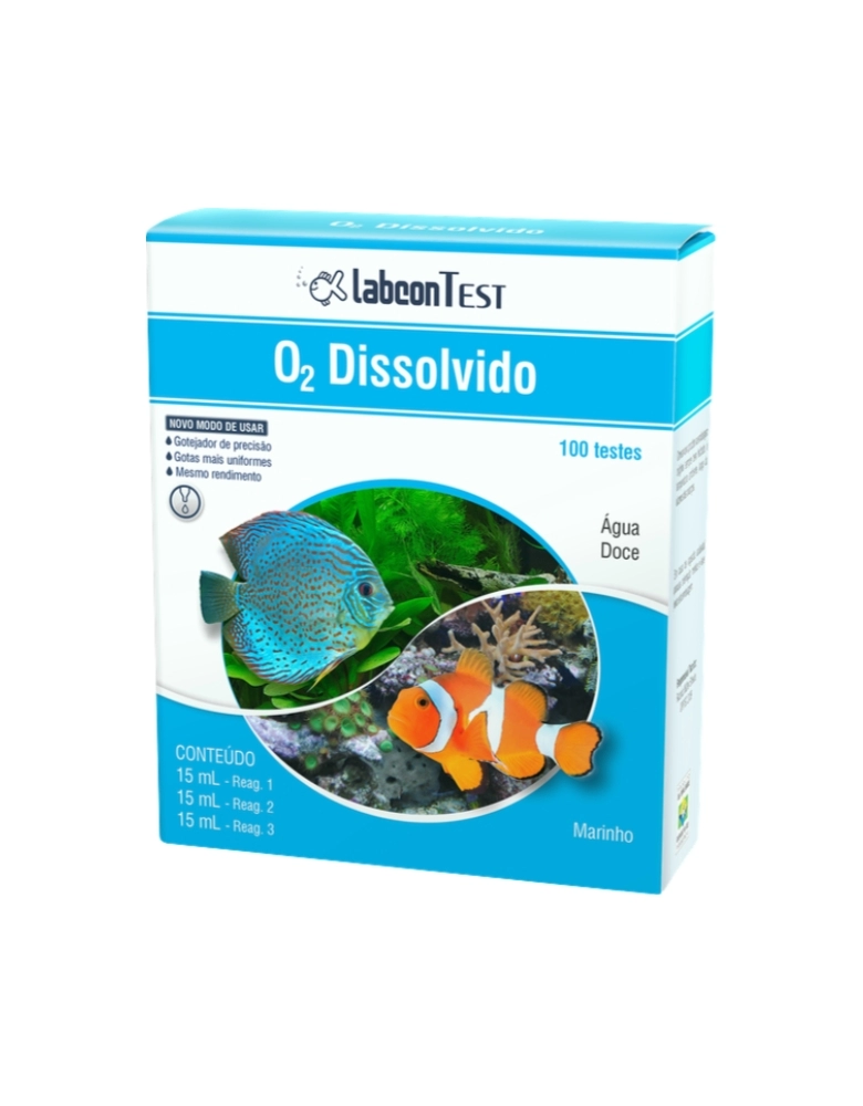Labcon Test O2 Dissolvido deve ser usado regularmente para monitorar a concentração de oxigênio na água do aquário, garantindo o bem-estar dos peixes e o correto funcionamento do filtro biológico.