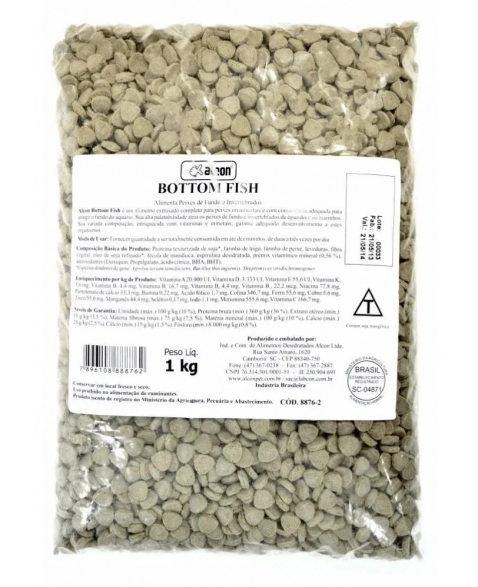 Alcon Bottom Fish foi especialmente desenvolvido para atingir o fundo do aquário. Com alta palatabilidade, atrai peixes e invertebrados de água doce e marinhos. De fácil digestão e enriquecido com vitaminas e minerais, garante uma refeição completa e equilibrada para Botias, Coridoras e Cascudos. Para a manutenção adequada dos aquários utilize a linha de testes, condicionadores e corretivos Labcon.