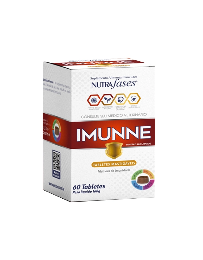 Nutrafases Imunne é um suplemento alimentar para cães composto por diversas vitaminas, minerais, aminoácidos e ingredientes que auxiliam na melhora do sistema imunológico.