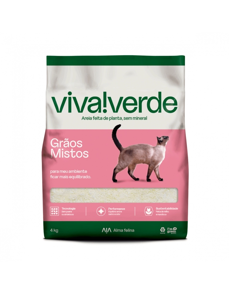 A Viva!Verde Grãos Mistos representa o equilíbrio entre controle de rastro e eliminação do odor de urina. Feita apenas de milho e mandioca, é livre de poeira, indicada por médicos veterinários, além de ser a areia higiênica preferida do Encantador de Gatos, Jackson Galaxy.